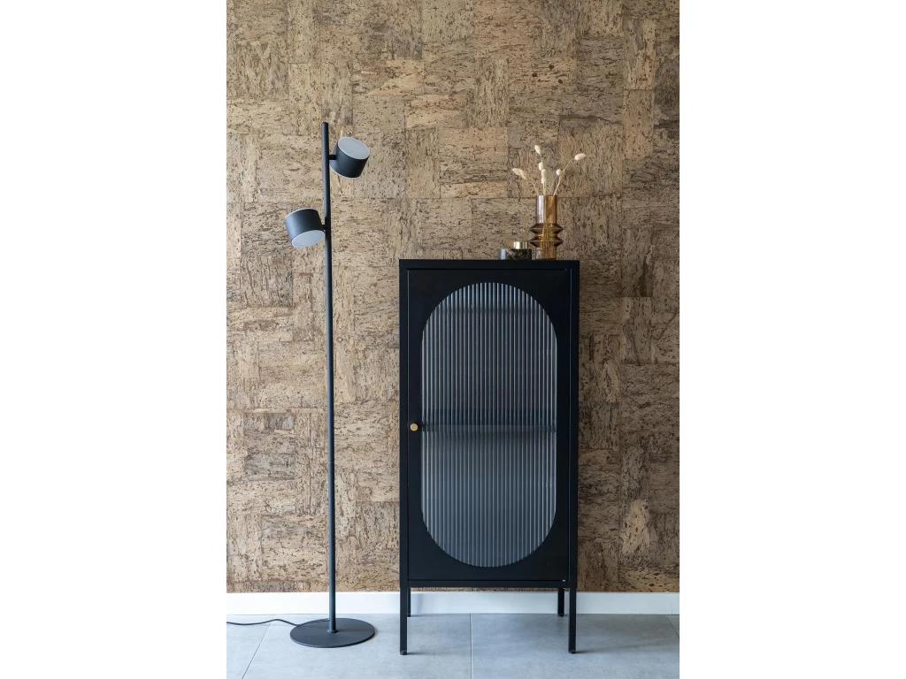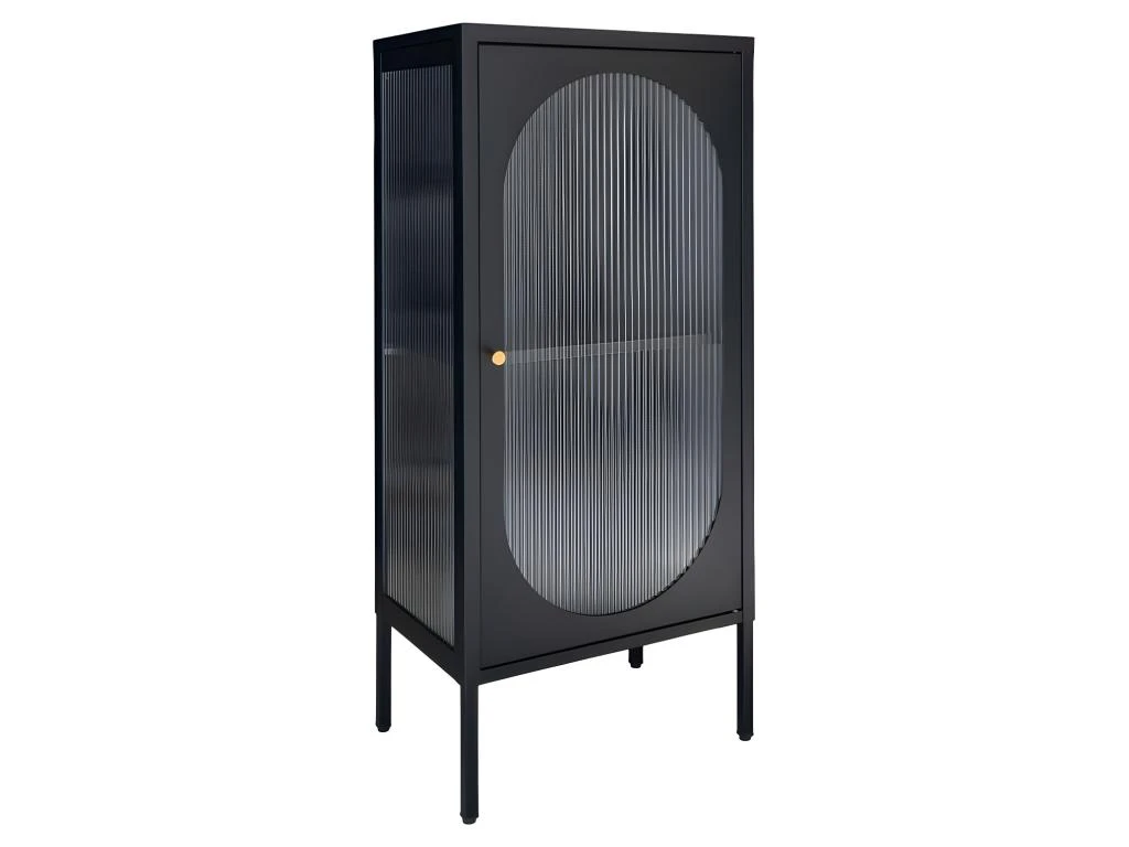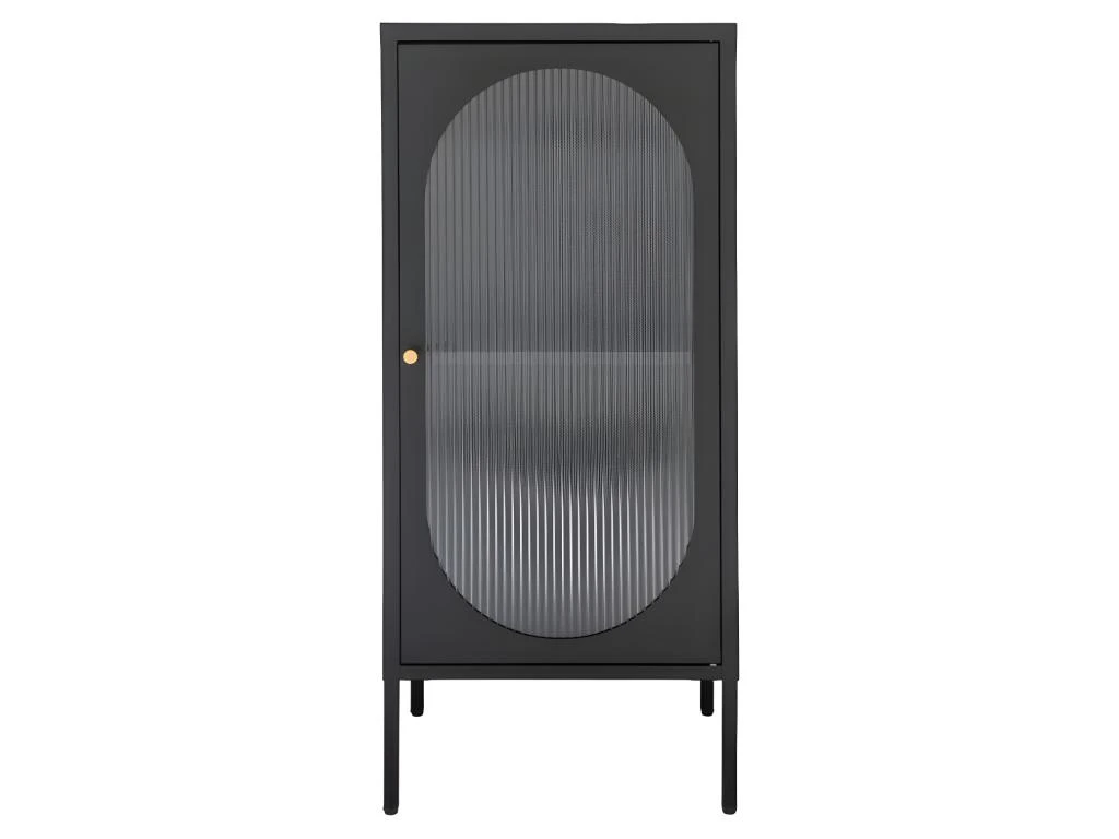 Ce meuble en métal noir mesure 110 cm en hauteur, 50 cm en largeur et 35 cm en profondeur. Il est doté d’une porte en verre strié à bords arrondis qui apporte un côté un peu vintage, tandis que les lignes simples du meuble le rendent plutôt contemporain. Il est pourvu d’une petite poignée de porte dorée discrète et de pieds fins qui allègent l’ensemble. À l’intérieur, une étagère sépare 2 grands espaces de rangement.