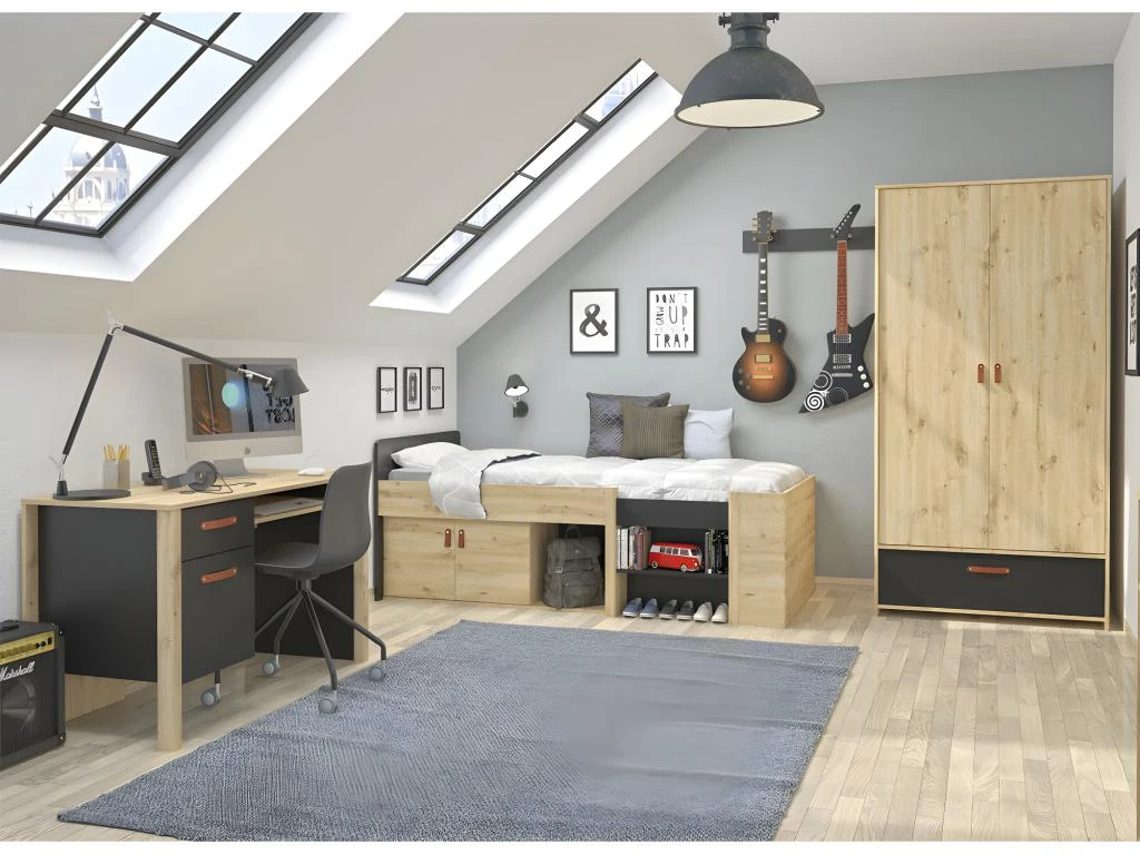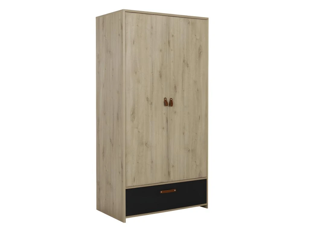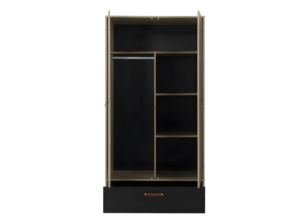 Parfaite pour une chambre au goût du jour et puisant son inspiration dans le mobilier Industriel cette armoire dressing à la taille contenue met en avant une finition Chêne nature au rendu très probant mis en contraste par une touche de teinte noire et des poignées en cuir véritable.