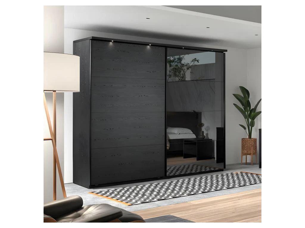 Mariant un corpus et une porte finition bois noir au rendu plus vrai que nature cette majestueuse armoire 2 portes coulissantes s’intègrera à tous les code couleurs, elle apportera en outre de la profondeur à votre chambre grâce à sa porte miroir.