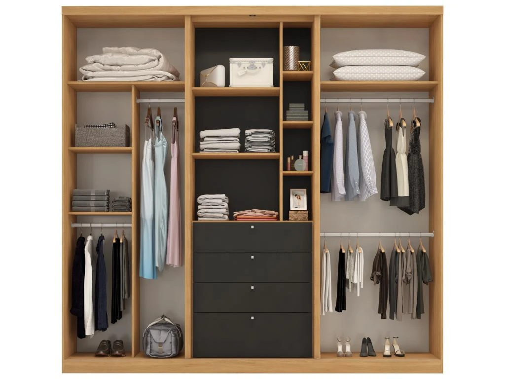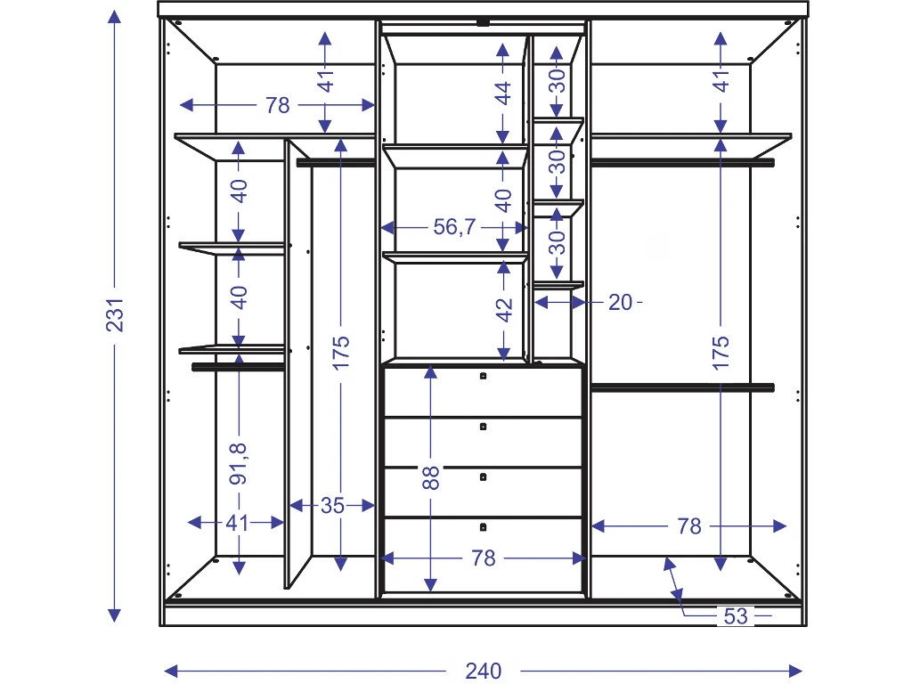 Entreposez vos affaires facilement grâce à cette grande armoire aux nombreux rangements! Avec ses 4 niches, ses multiples lingères et penderies ainsi que ses 4 tiroirs, cette armoire vous permettra de ranger vos vestes et costumes ainsi que vos pantalons et t-shirt!