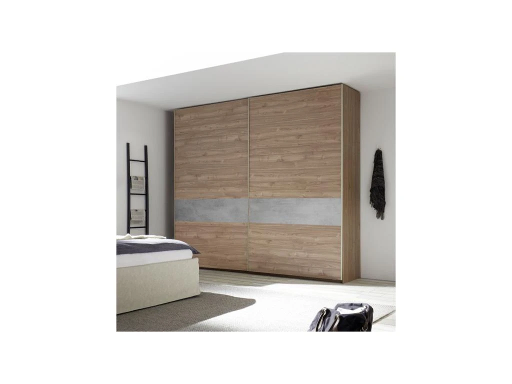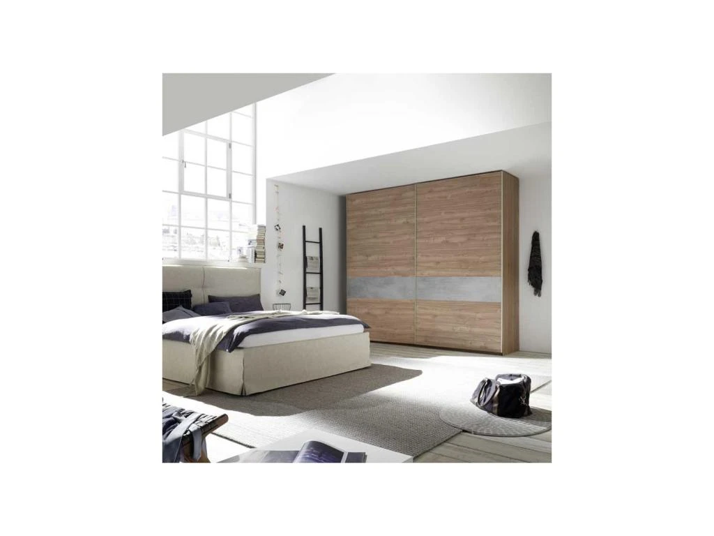 L’incrustation de mélamine ciment au rendu probant rythme les 2 portes et modernise sagement cette grande armoire.