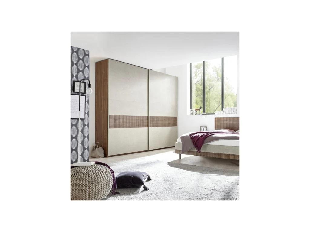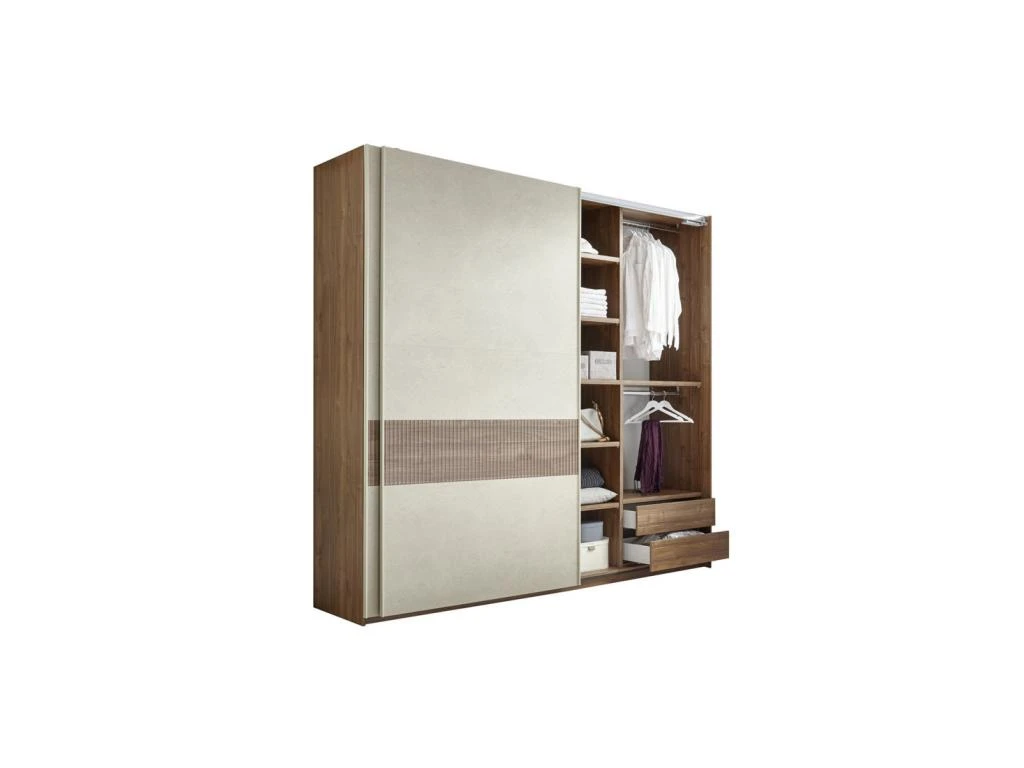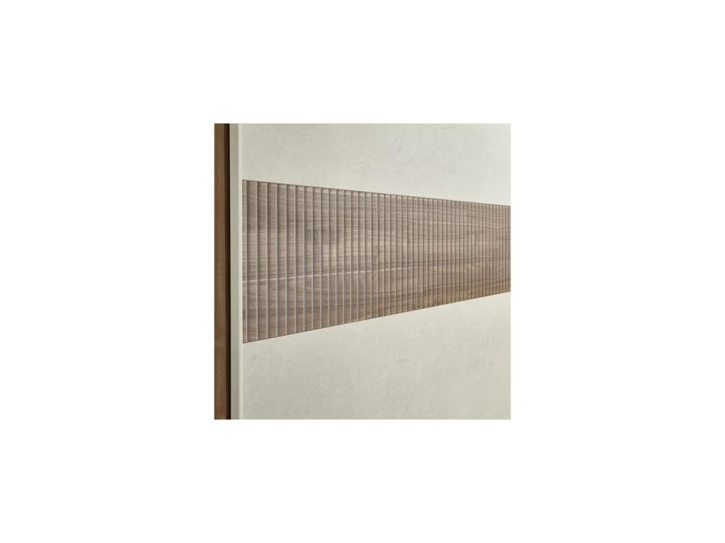 Pour moderniser cette grande armoire les 2 portes mettent en avant une mélamine teinte argile contemporaine et lumineuse et qui proposent une sérigraphie ton noyer foncé assorti au corpus.