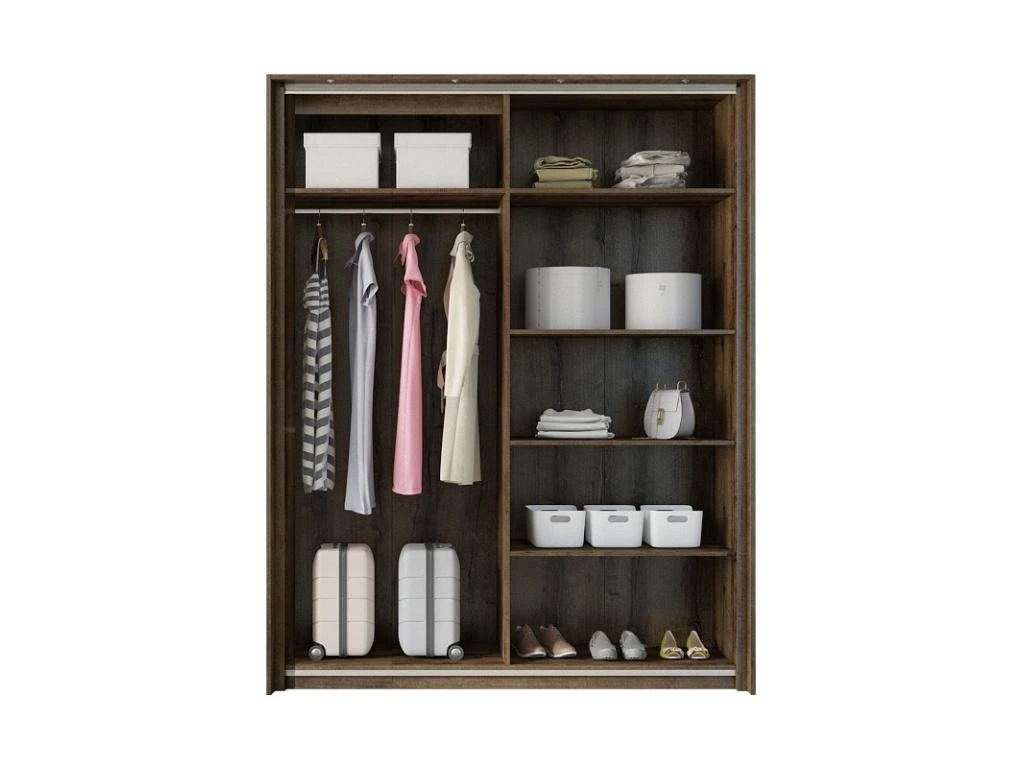 Cette garde robe sublimera votre chambre avec son coloris chêne foncé. Ses grands miroirs seront parfaits pour vos séances d’essayage et apporteront clarté et luminosité à votre chambre. L’intérieur est muni de nombreux espaces de rangement : deux penderies et cinq grandes étagères de rangements afin d’en faire un dressing qui accueillera aisément toute votre garde-robe.