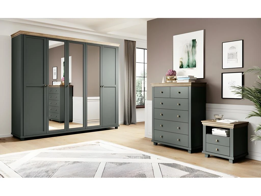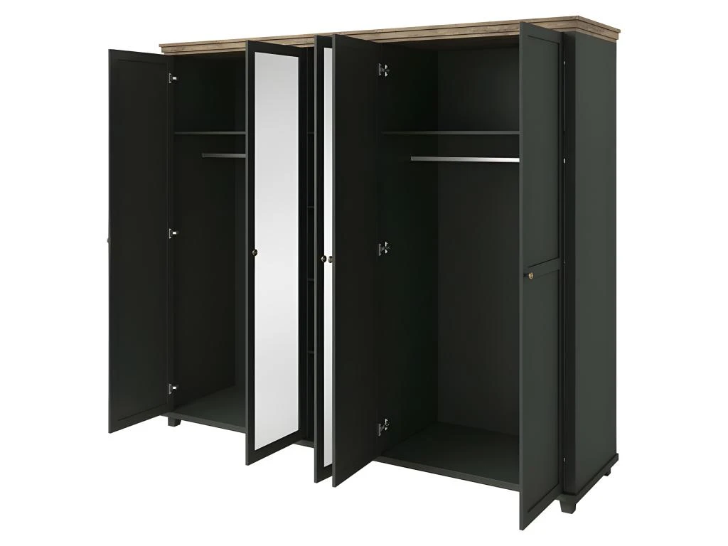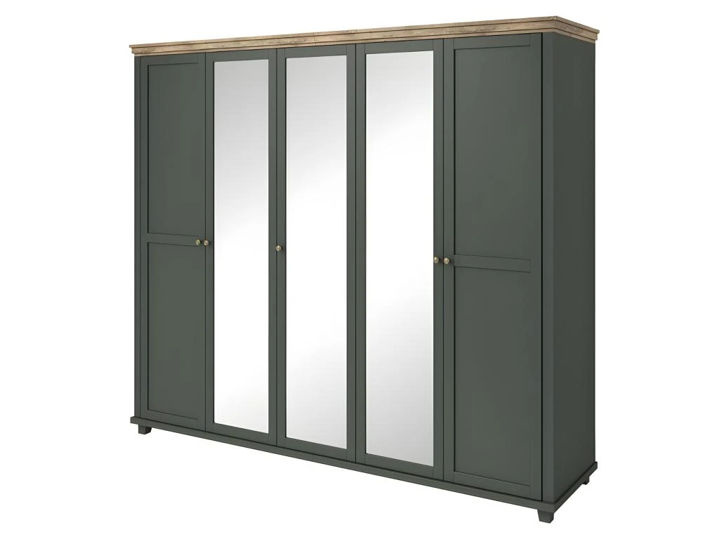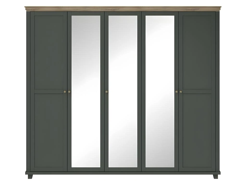 Armoire avec cinq portes dont trois avec un grand miroir. Cette garde robe vous charmera grâce à ses couleurs tendances et ses finitions soignées.