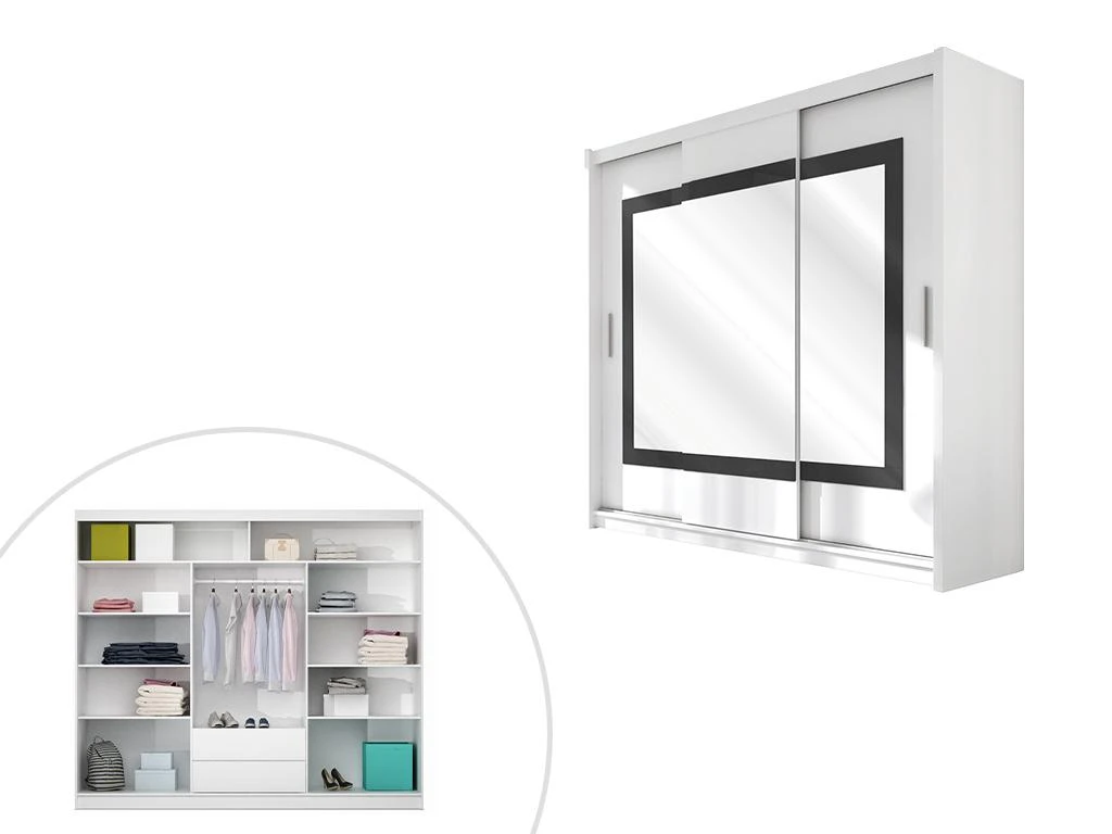 L’armoire AUTLAN vous offre un bel espace de rangements grâce à sa grande penderie et ses nombreuses lingères. Equipée de deux grands miroirs sur les portes coulissantes, vous pourrez facilement vous admirer de haut en bas dans vos plus belles tenues !