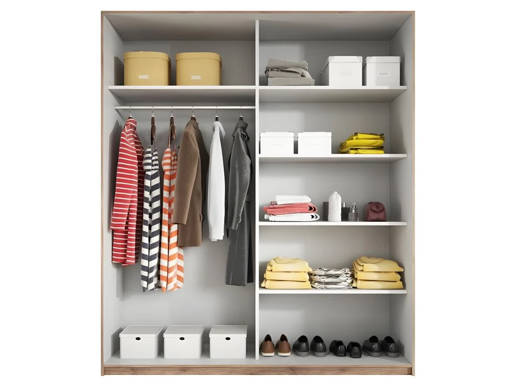 Cette garde robe sublimera votre chambre avec son coloris chêne clair et blanc. Composée de 2 portes avec un miroir. central. Ce grand miroir sera parfait pour vos séances d’essayage et apporteront clarté et luminosité à votre chambre. L’intérieur est muni de nombreux espaces de rangements : une grandes penderies et 5 étagères afin d’en faire un dressing qui accueillera aisément toute votre garde-robe.