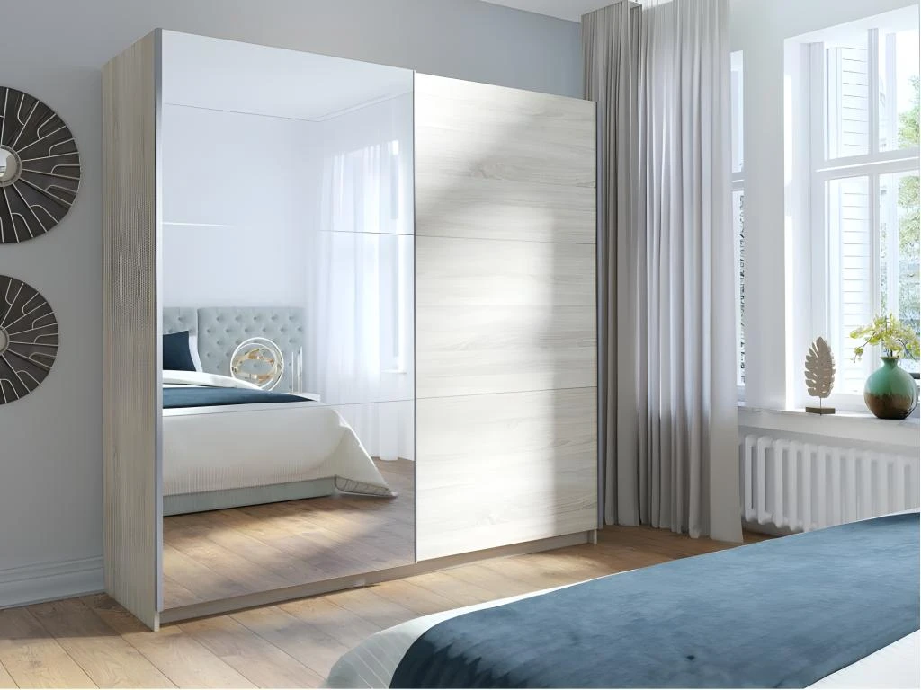 – COMPOSITION : 2 portes coulissantes avec miroir. L’intérieur est garni d’une penderie et d’étagères (x5).
