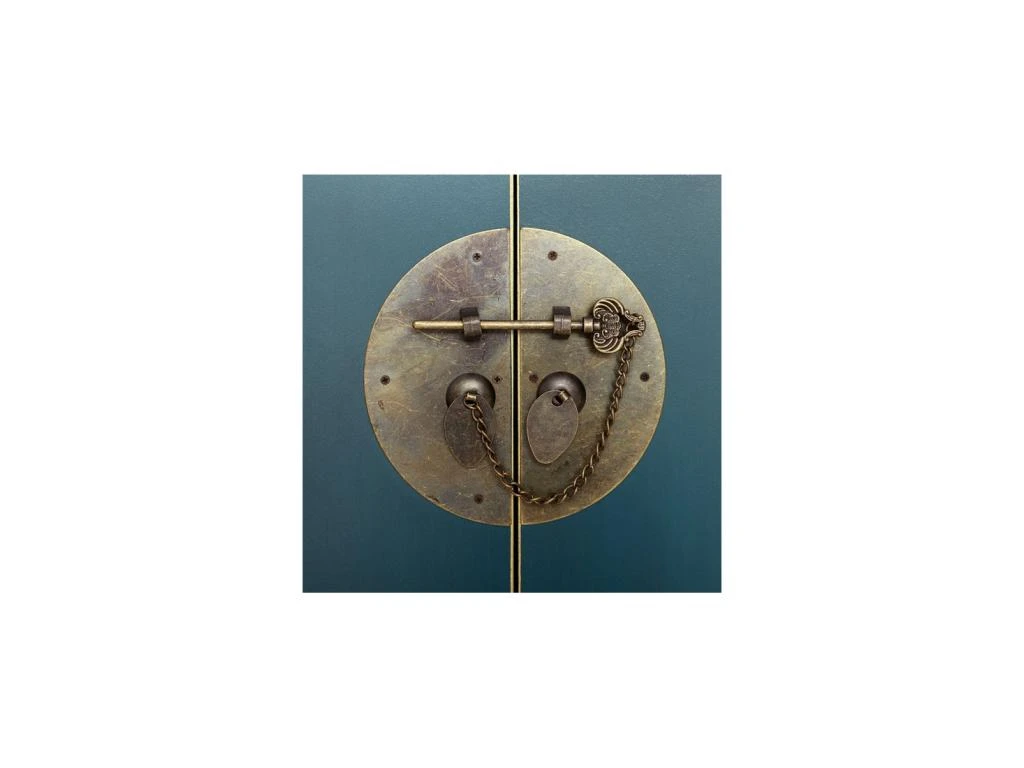 La teinte bleue se marie à la quincaillerie dorée, parfaitement raccord avec le style oriental de ce meuble multifonction sobre et élégant.