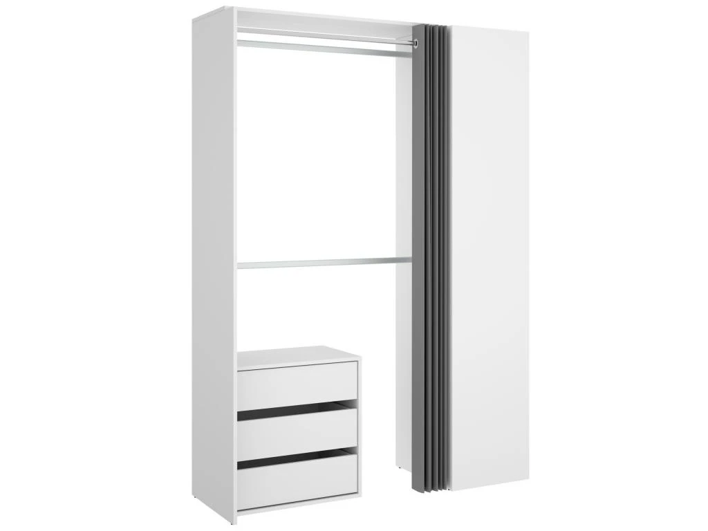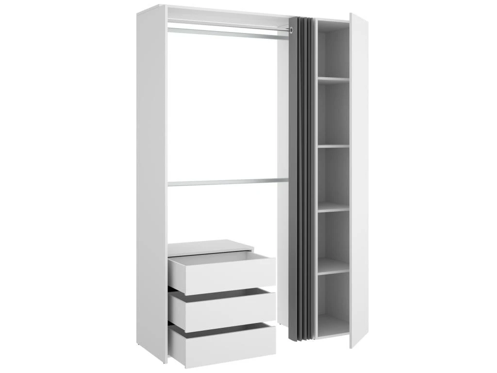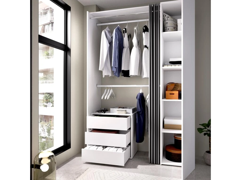 STRUCTURE ET UTILISATION – Armoire Ă rideau complète avec une armoire Ă colonnes avec porte battante et cinq compartiments internes, une commode avec trois grands tiroirs et deux tringles Ă vĂŞtements – Grâce Ă l’organisation interne de ses espaces, elle offre un grand espace de rangement – L’ensemble du meuble la structure est parfaite pour meubler une chambre double, une chambre d’enfants ou une chambre d’amis de manière peu encombrante – Les Ă©tagères internes combinĂ©es Ă la tringle Ă vĂŞtements vous permettront de ranger les vĂŞtements et les robes de manière ordonnĂ©e.