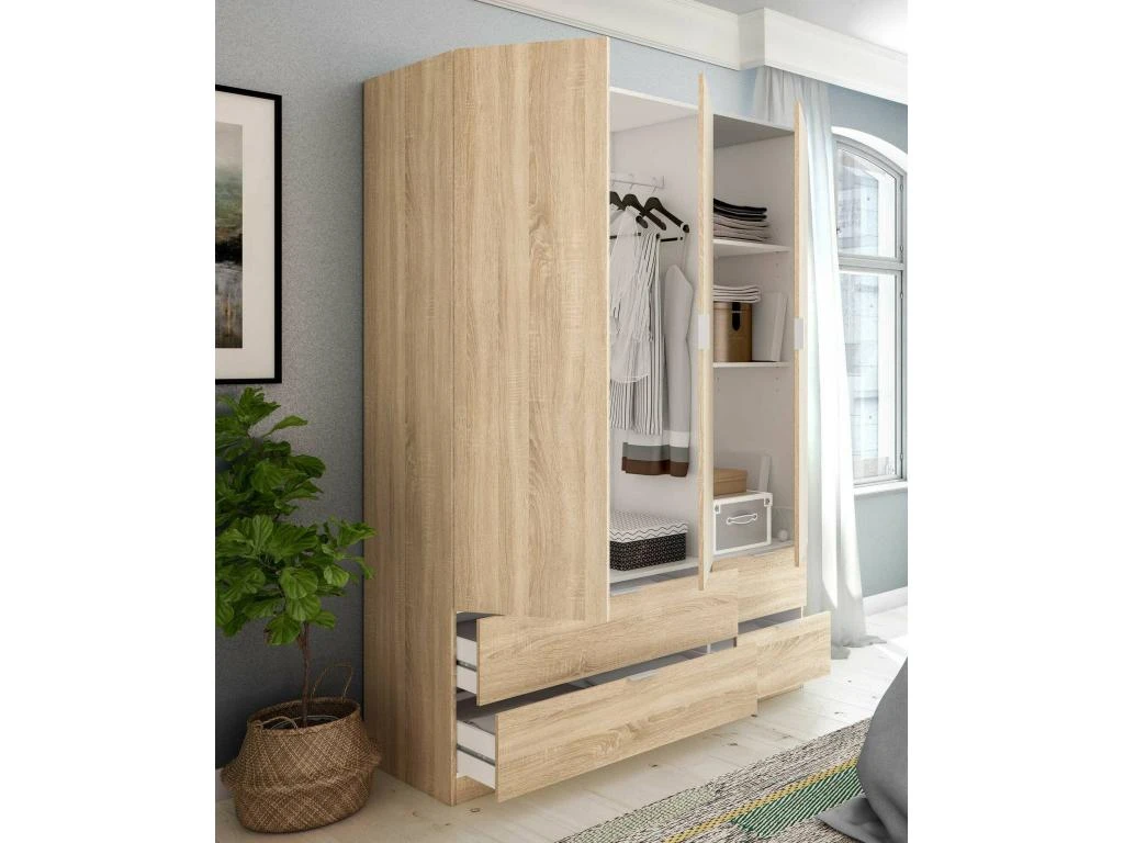STRUCTURE ET UTILISATION – Armoire complète de trois portes battantes et quatre tiroirs, à l’intérieur de deux étagères fixes, grâce à l’organisation interne de ses espaces elle offre un grand espace de rangement – Toute la structure du meuble est parfaite pour meubler une chambre dans un espace -façon économique un lit double, une chambre d’enfant ou une chambre d’amis – Les étagères internes combinées à la tringle à vêtements vous permettront de ranger vos vêtements et vêtements de manière ordonnée.