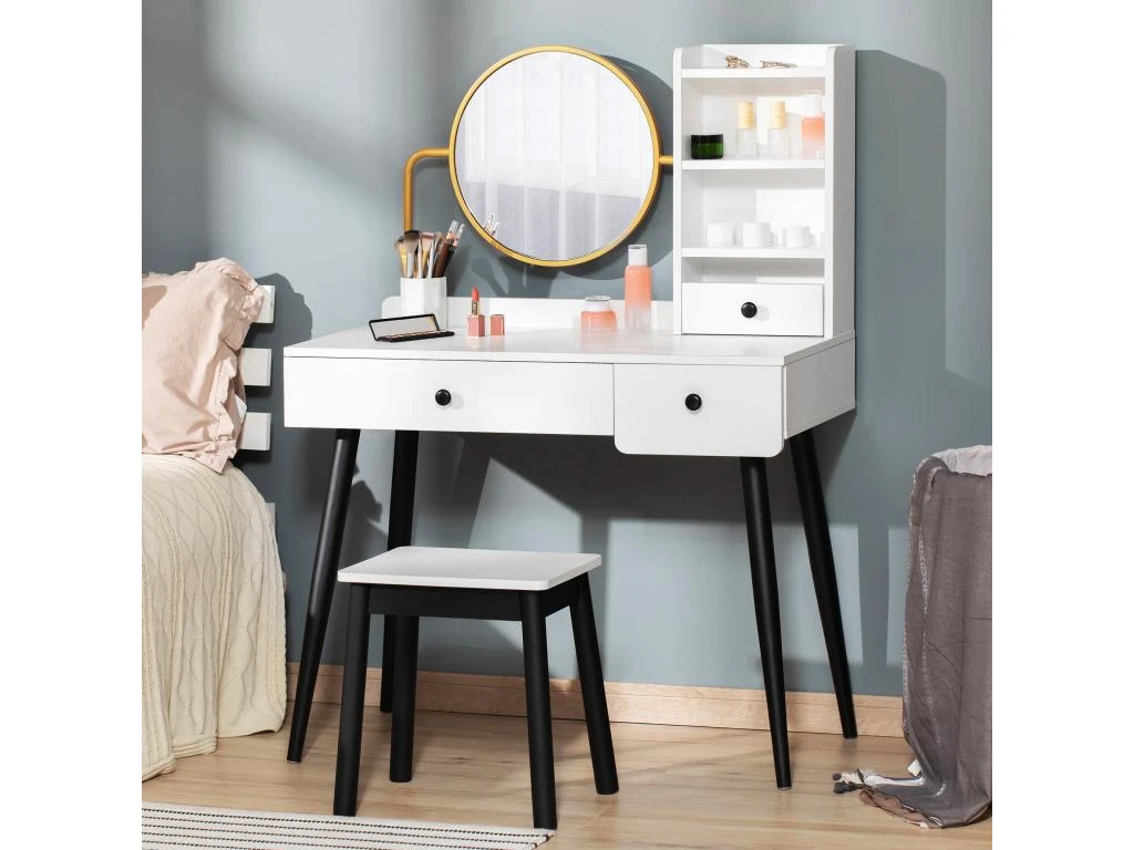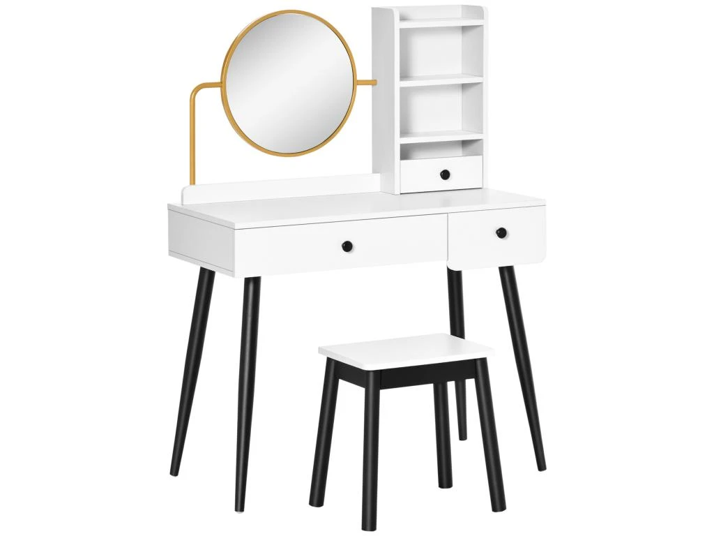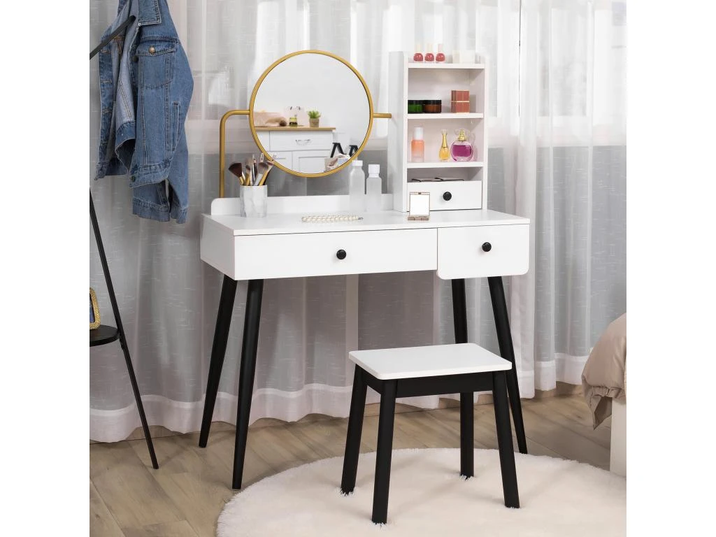 – Ensemble coiffeuse et tabouret style néo-rétro tricolore doré, noir, blanc pour une intégration parfaite dans votre chambre, dressing, ou autre espace
