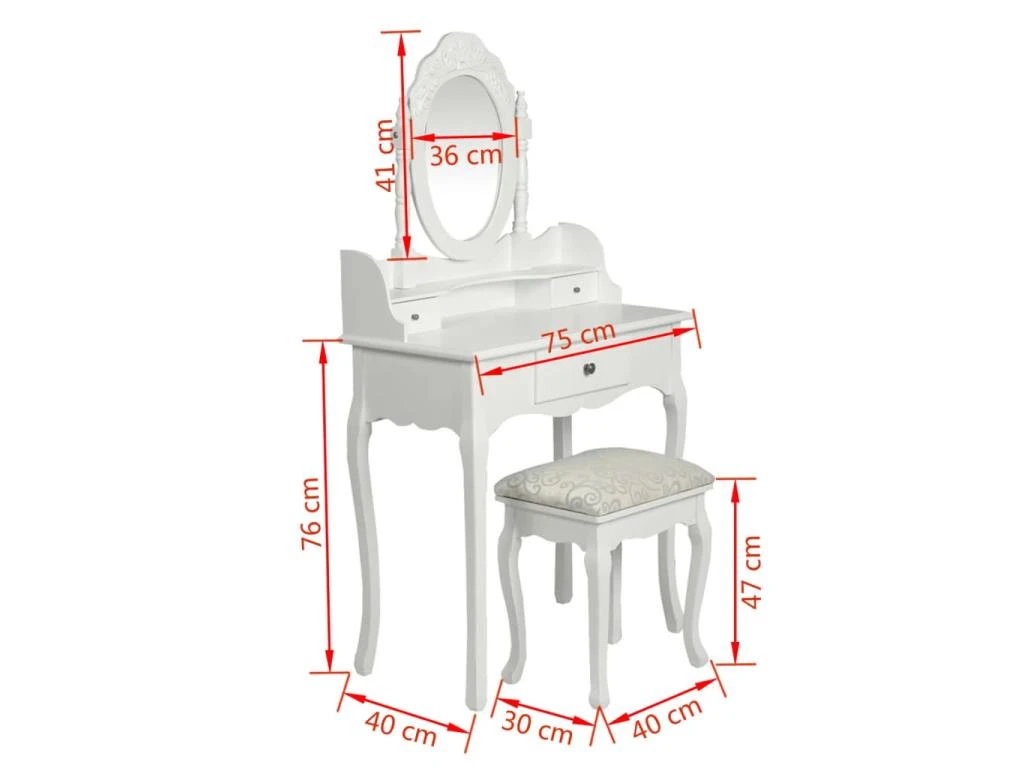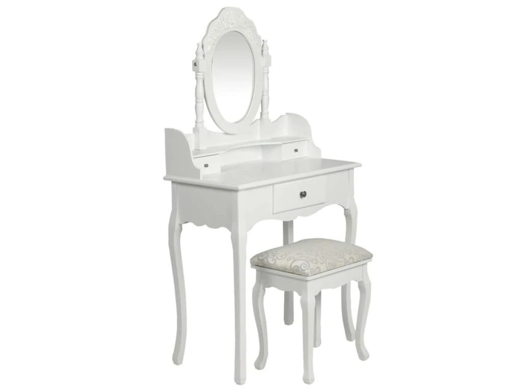 Cette jolie coiffeuse avec miroir, complète avec un tabouret, est faite à la main avec un artisanat de haute qualité.