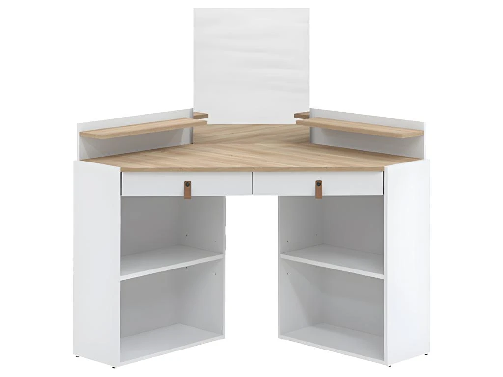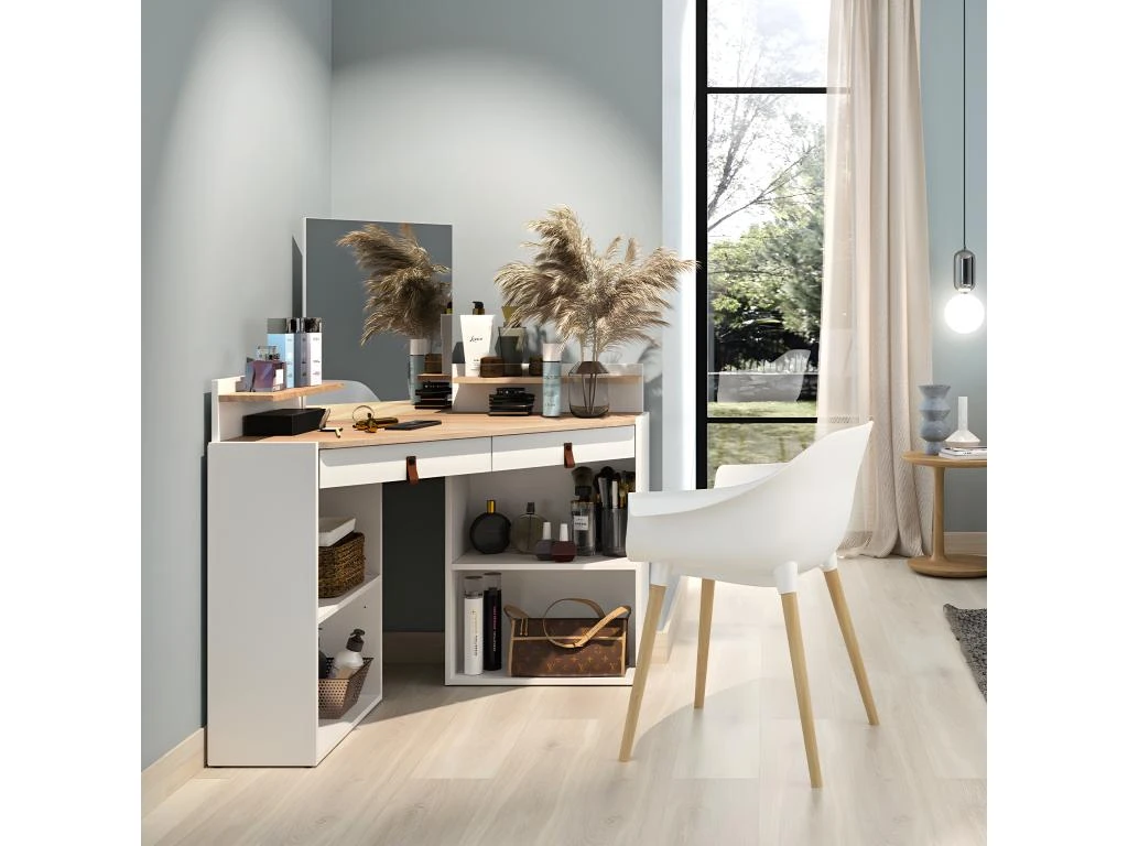 La coiffeuse d’angle GLOSS prend place dans un coin de votre chambre pour vous faire bénéficier d’un meuble discret et fonctionnel. Ses grandes niches et ses 2 tiroirs garantissent un espace spacieux pour tous vos produits de beauté. Son miroir intégré de 54.3 cm vous permet un confort inégalé.