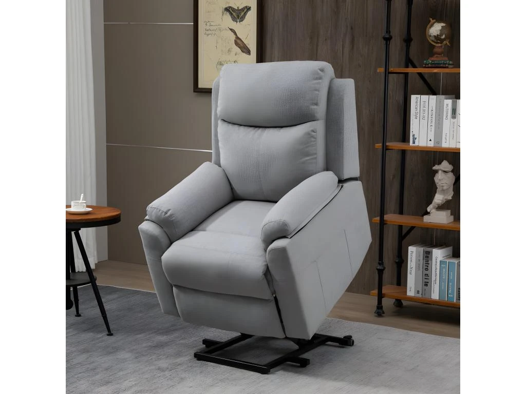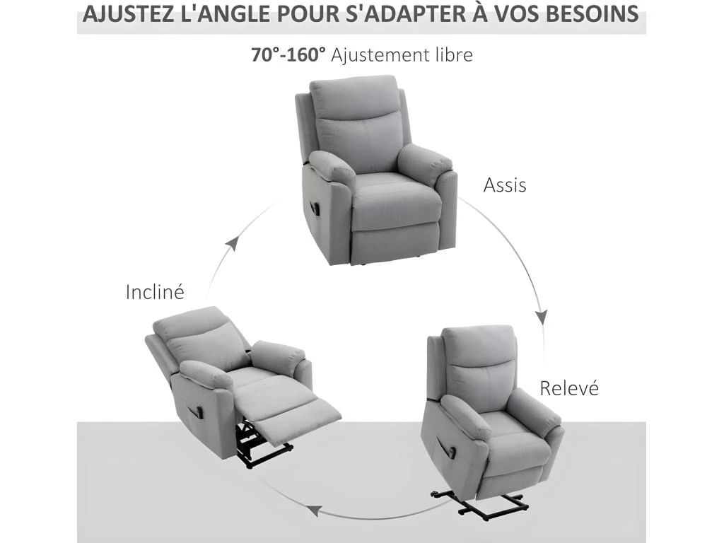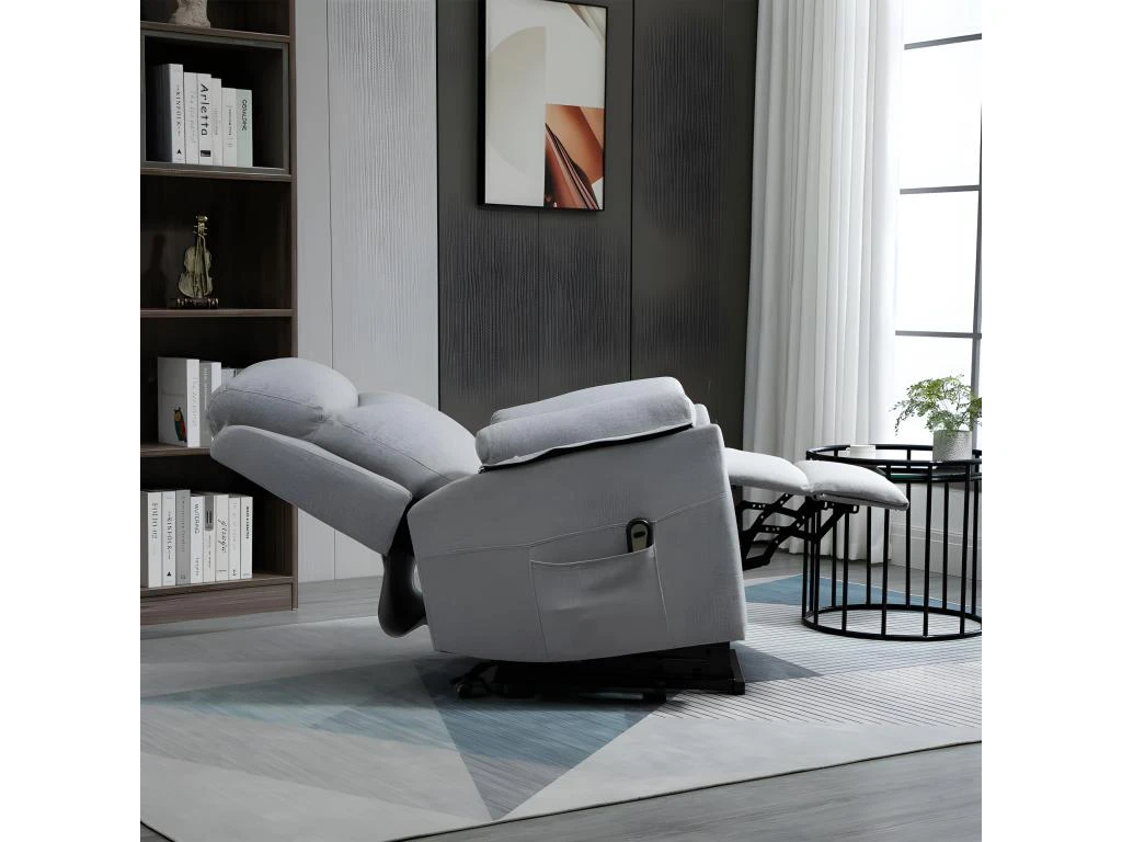 Caractéristiques : – Fauteuil releveur de relaxation électrique style contemporain épuré pour une parfaite intégration à votre intérieur – Équipé d’un dossier inclinable (jusqu’à 160°) et d’un repose-pieds relevable électriquement par télécommande – Fonction releveur assurée par un vérin hydraulique – Fauteuil idéal pour les personnes âgées ou à mobilité réduite – Assise dotée d’un épais garnissage mousse haute densité 24 Kg/m3 tout comme le dossier (20 Kg/m3) – Revêtement en tissu polyester aspect lin haute densité 280 g/m² très perméable à l’air et donc très agréable au toucher par n’importe quelle condition : chaleur ou fraicheur – Grande fléxibilité et souplesse grâce au système de ressort sous-jacent – Accoudoirs, appui-tête et dossier ergonomique pour un confort d’installation optimal – Poche latérale de rangement pour votre télécommande, vos journaux ou autres – Certifications normes CE-EMC, RoHS, ERP, LVD Spécifications : – Couleur : gris clair chiné – Matériaux principaux : polyester aspect lin, garnissage mousse, MDF, acier – Dim. totales : 83L x 89P x 102H cm – Dim. position inclinée : 83L x 153P x 86H cm – Dim. position relevé : 83L x 82P x 135H cm – Inclinaison max. de 160° – Dim. assise : 46L x 53P x 86H cm – Dim dossier : 76,5l x 62,5H cm – Tension d’entrée : 100-230 V 50/60 Hz – Tension de sortie : 29 V 2 A – Longueur câble d’alimentation : 1,5 m (télécommande : 2 m) – Charge max. reco. : 120 Kg – Livraison effectuée en un colis