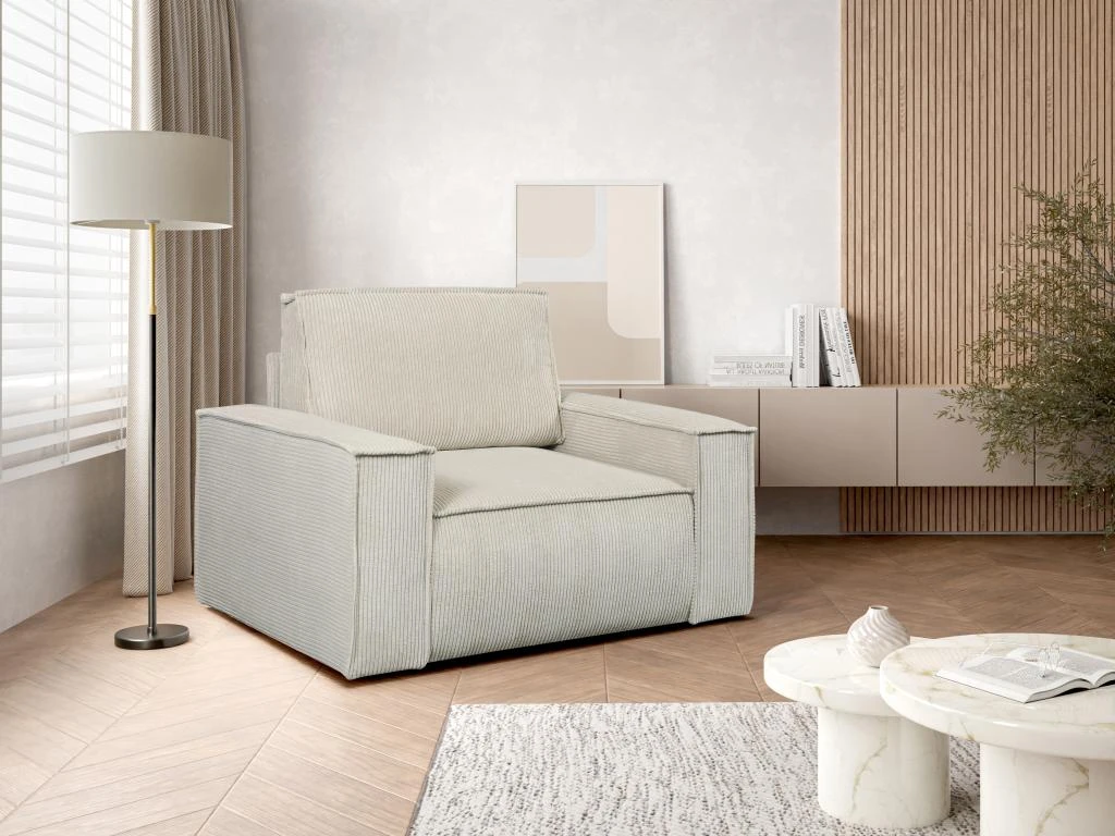 Le canapé convertible ou le fauteuil AMELIA en velours côtelé sont les pièces qui viendront sublimer votre salon grâce à sa matière douce et élégante. Le canapé convertible est aussi très fonctionnel : convertible et pratique, vous pourrez le transformer en un couchage supplémentaire très rapidement et aussi ranger vos affaires dans le coffre sous l’assise.
