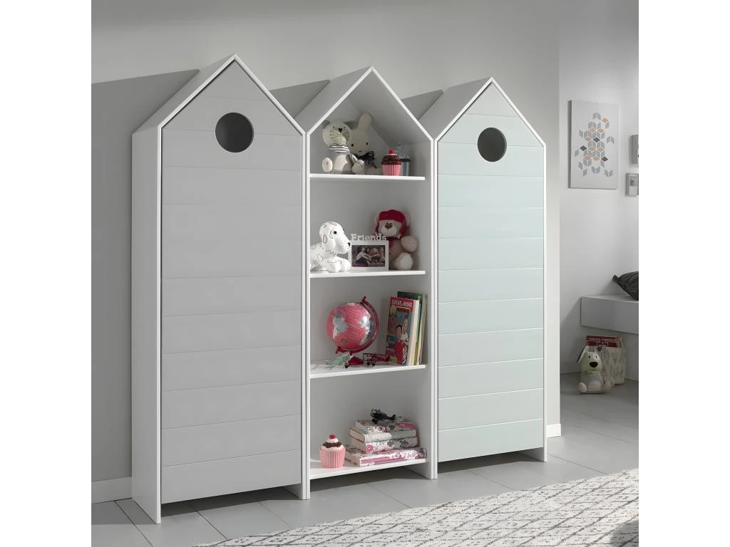 Ensemble composé d’une Bibliothèque à 4 Niveaux Blanche, d’une Armoire Penderie 1 Porte Verte et d’une Armoire Penderie 1 Porte Grise, en forme de cabane de plage, de la gamme Havre.