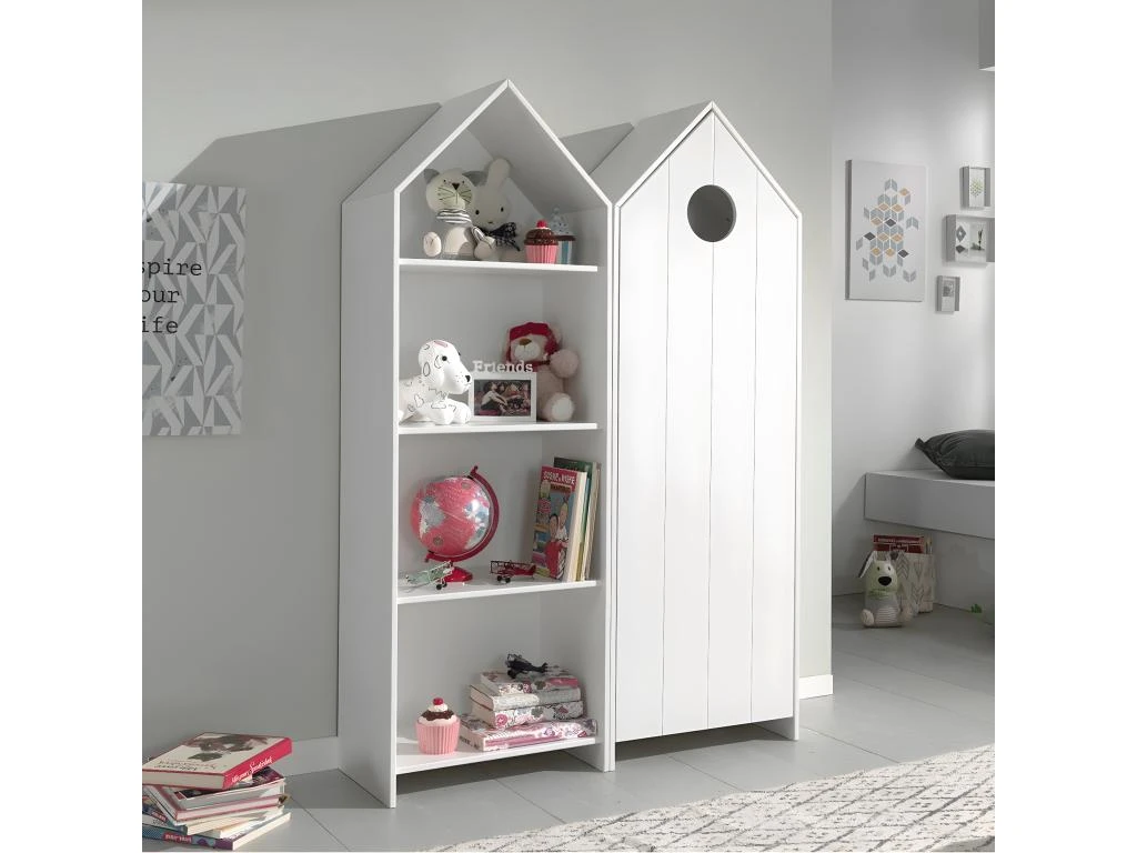 Ensemble composé d’une Bibliothèque à 4 Niveaux Blanche et d’une Armoire Penderie 1 Porte Blanche, en forme de cabane de plage, de la gamme Havre.
