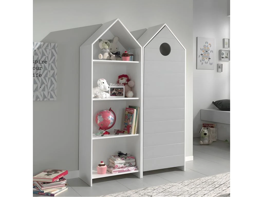 Ensemble composé d’une Bibliothèque à 4 Niveaux Blanche et d’une Armoire Penderie 1 Porte Grise, en forme de cabane de plage, de la gamme Havre.