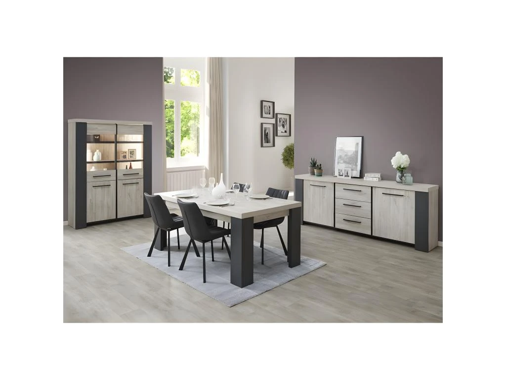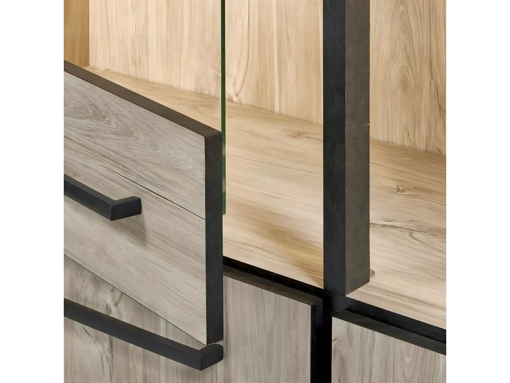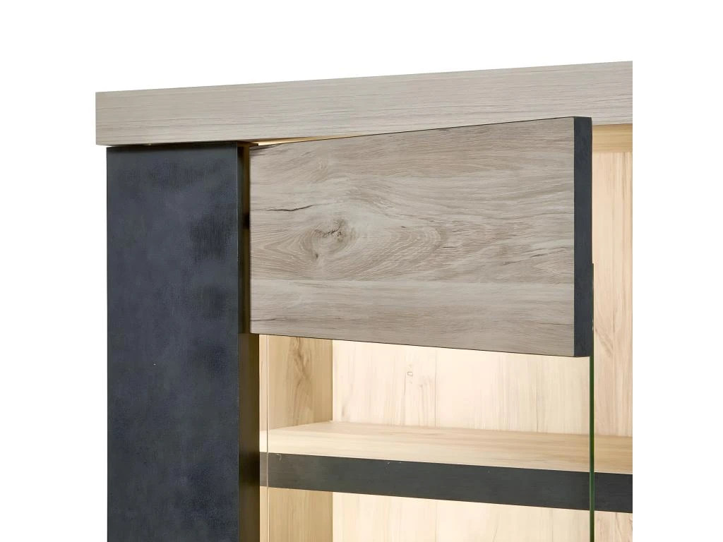 Un ensemble de meubles arborant divers revêtements pour un effet visuel élégant. En plus de sa partie supérieure équipée de 2 portes en verre et d’un éclairage, la vitrine dispose de 2 grands rangement inférieurs.