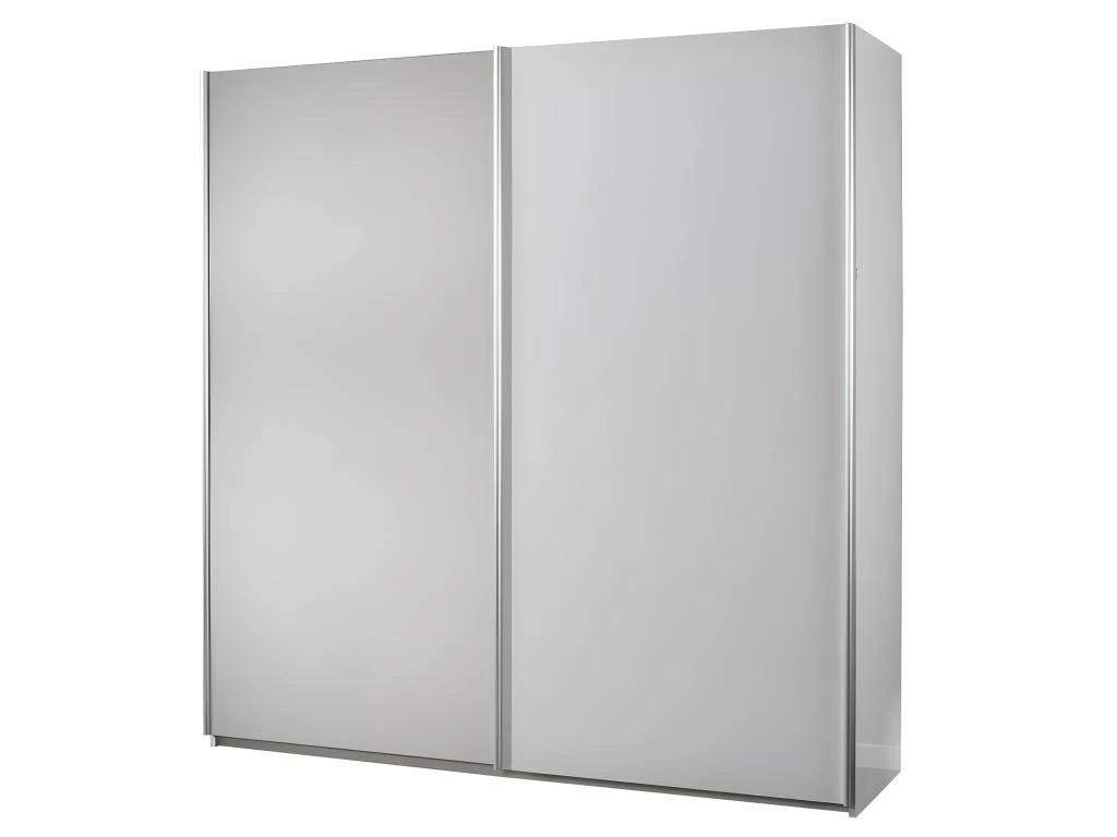 Structure en panneaux de particules ép. 18mm. Finition laqué brillant coloris blanc. Portes coulissantes. Miroir en façade. Intérieur : 2 penderies et 2 grandes étagères.