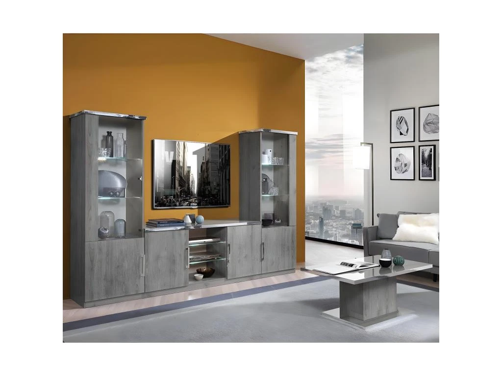 Une Vitrine élégante grâce à sa finition laquée brillante et son aspect chêne du plus bel effet. Enreposez sans soucis vos affaires derrières la porte vitrée ou la porte pleine. Pour des ensembles complets et assortis, retrouvez tous nos packs séjour et salon de la gamme Naktam !