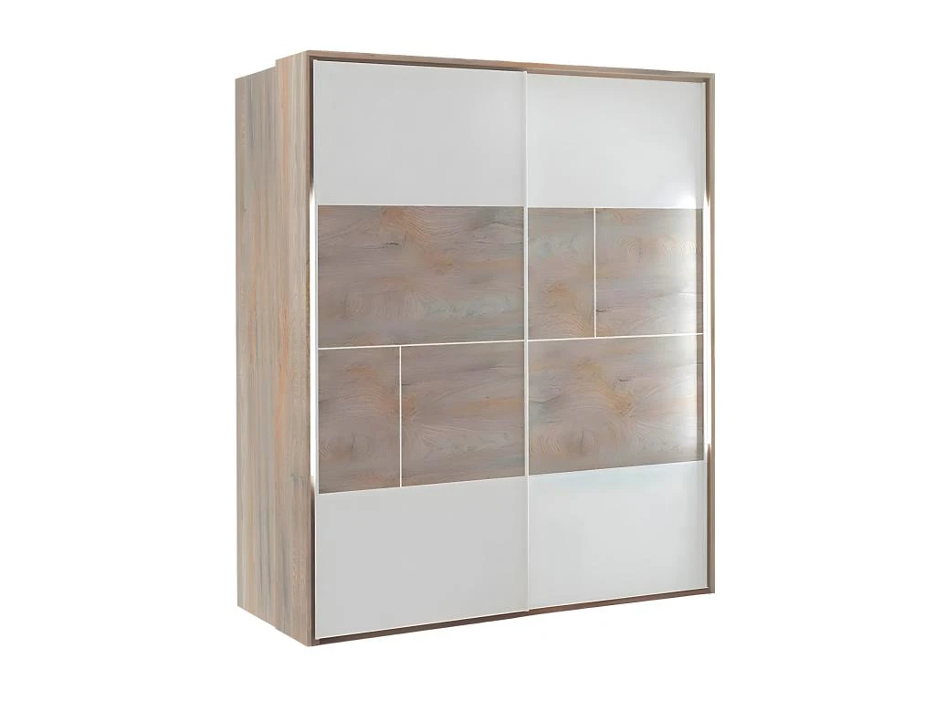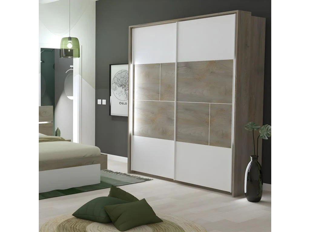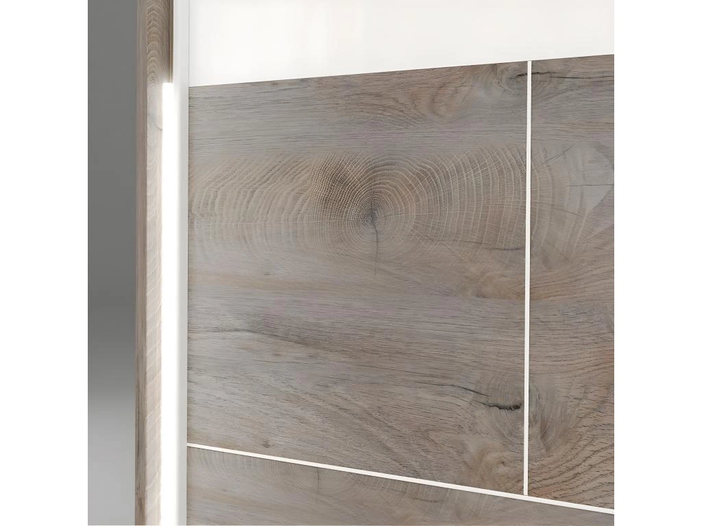 MADE IN FRANCE : Ensemble composé de l’Armoire Effet Bois 2 Portes Coulissantes à Frein et de l’Arche avec éclairage Led de la gamme Nino Light.