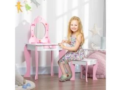 Coiffeuse Enfant Design Girly Motif Coeur – Tiroir, Miroir, Tabouret Inclus – MDF – Blanc Rose
