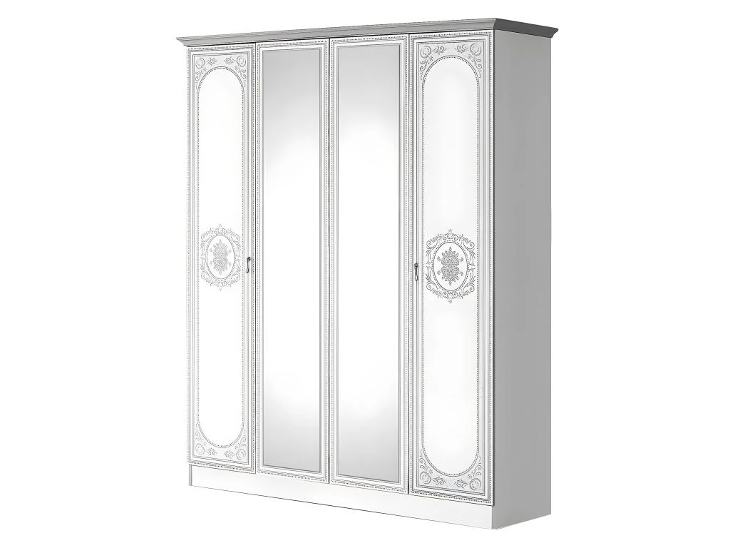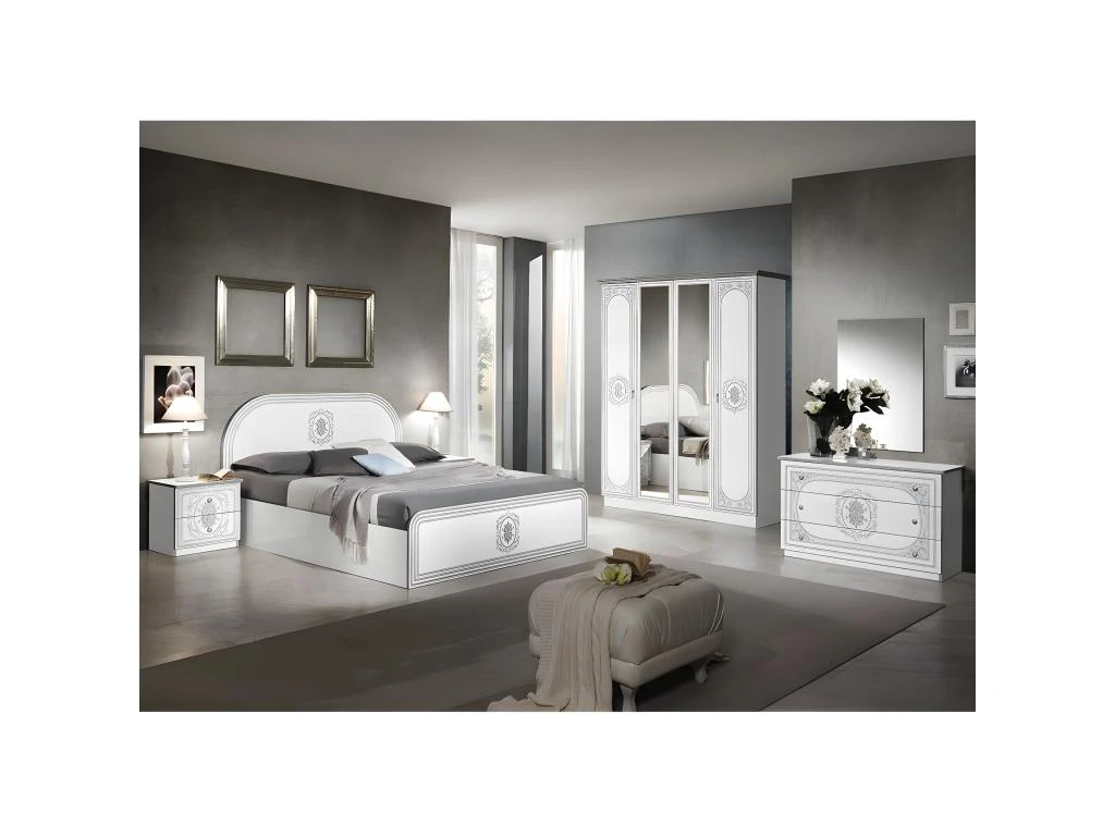 Structure en panneaux de particules Ep. 18mm, revêtement en mélaminé blanc brillant. Champs et Corniche en mélaminé gris. 2 portes en panneaux de particules Ep. 18mm, revêtement en mélaminé blanc, champs en mélaminé gris, motif arabesque sérigraphié argenté et 2 portes miroirs. Dos en MDF. Poignées métalliques. Côté droit : 3 tablettes de rangement. Côté gauche : 1 tablette supérieure + 1 penderie.