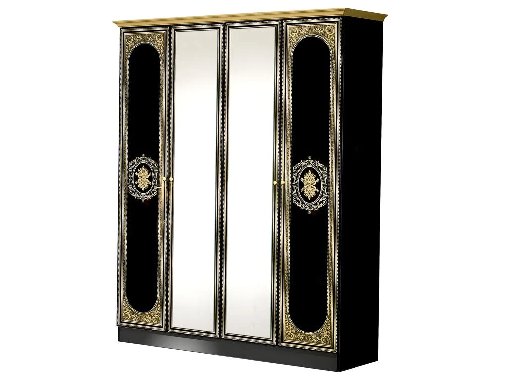 Structure en panneaux de particules Ep. 18mm, revêtement en mélaminé noir brillant. Corniche en mélaminé couleur dorée. 2 portes en panneaux de particules Ep. 18mm, revêtement en mélaminé noir, motif arabesque sérigraphié doré et 2 portes miroirs. Dos en MDF. Poignées métalliques. Côté droit : 3 tablettes de rangement. Côté gauche : 1 tablette supérieure + 1 penderie.