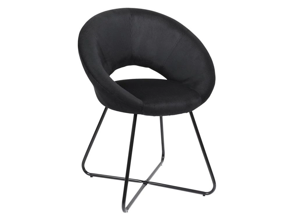 Ensemble repas composé de la Table Allongeable 120-160cm avec plateau effet bois et piétement scandinave métallique noir, et de 4 Fauteuils ajourés en Velours Côtelé Konae (2 coloris Ocre et 2 coloris Noir).