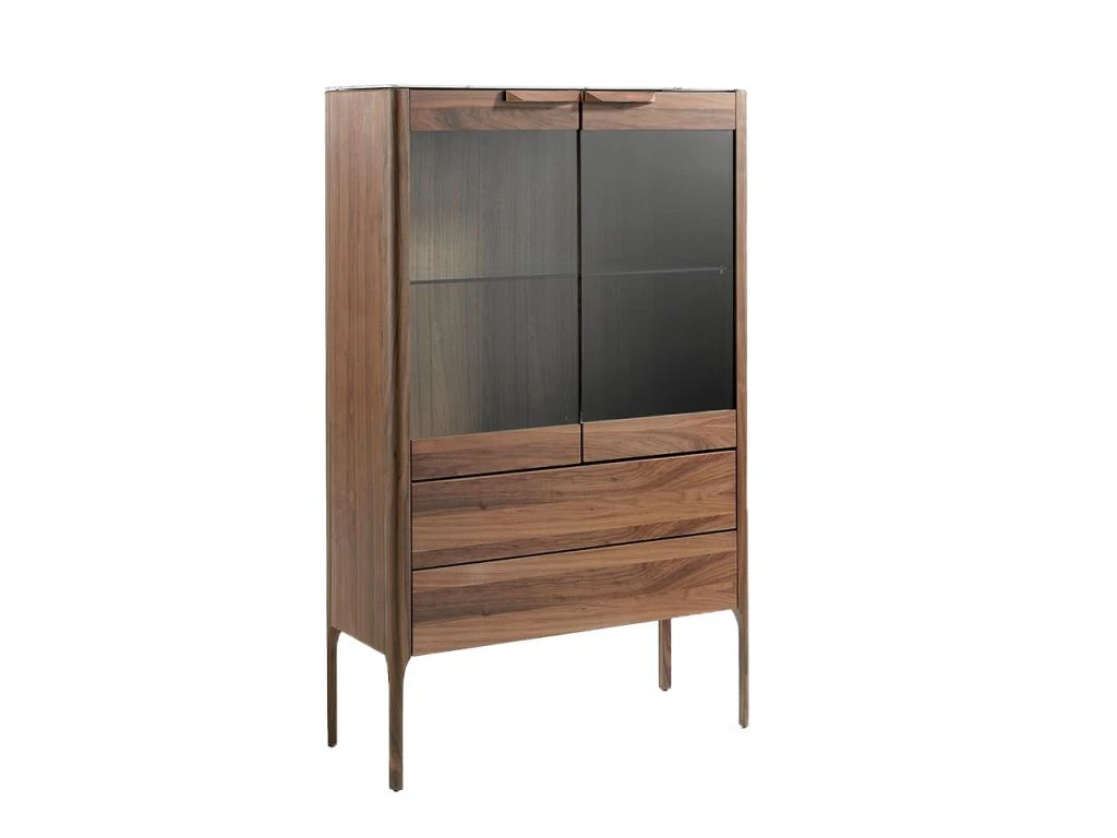 Vitrine au design moderne en bois plaqué noyer naturel de 0,5 mm d’épaisseur et un élégant plateau en fibre de verre effet marbre Calacatta de 4 mm d’épaisseur. Une vitrine de style élégant et sophistiquée parfaite pour apporter la touche de chaleur et de style que vous recherchez à votre pièce, ainsi que pour garder tout en ordre grâce à son grand espace de rangement avec ses deux portes en verre trempé avec poignées en acier couleur cuivre et ses deux tiroirs avec système d’ouverture push et fermeture amortie. Son intérieur, composé d’étagères et de tiroirs en verre trempé de 6 mm avec éclairage intérieur intégré, en font une pièce complète et polyvalente, qui allie parfaitement élégance et fonctionnalité
