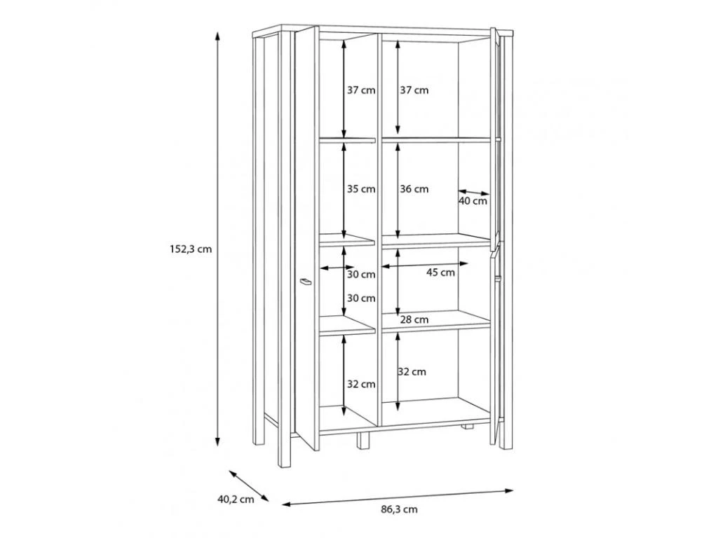 - DÉTAILS ET POIDS MAXIMUM SUPPORTÉ : 1 pied de soutien. La partie supérieure du meuble : 20 kg. 3 portes battantes dont 1 porte vitrée avec 4 étagères réglables en hauteur : 5 kg et 4 étagères fixe : 10 kg. 2 compartiments ouverts : 10 kg.