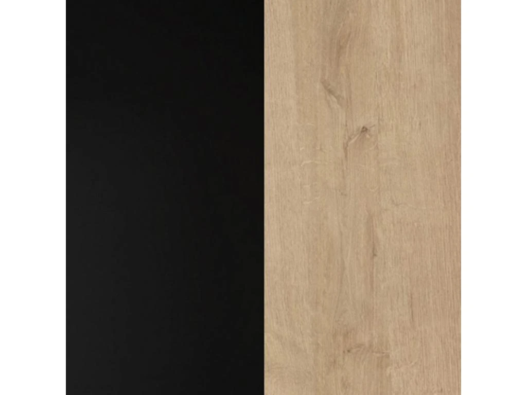 - COMPOSITION : Structure en panneaux de particules 15 mm et plateau supérieur 22 mm d’épaisseur. Revêtement papier décor noir mat et chêne. Porte en verre 15 mm. Panneaux arrière en HDF 2 mm. Poignées en métal noir mat.