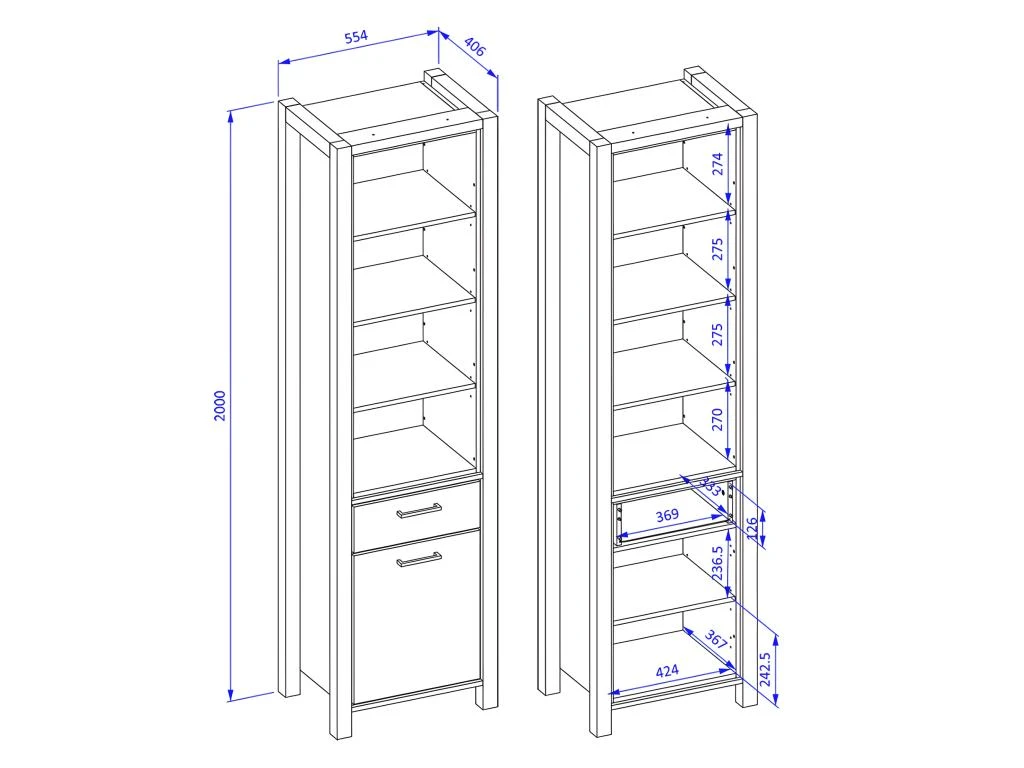 Les dimensions de cette vitrine sont L55xH200xP41, elle est donc idéale pour les espaces réduits tout en offrant une grande capacité de rangement.