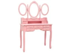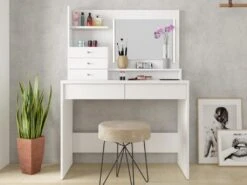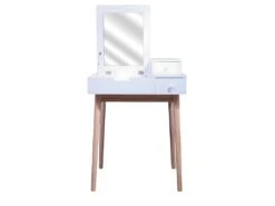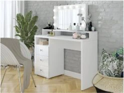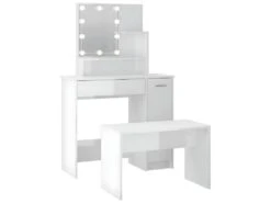 Un Must-Have, les filles. Pratique : cette coiffeuse dispose de 2 tiroirs, et d’un miroir rabattable dissimulant un grand espace de rangement. Après usage, glissez le banc sous votre coiffeuse pour ne perdre aucun espace !